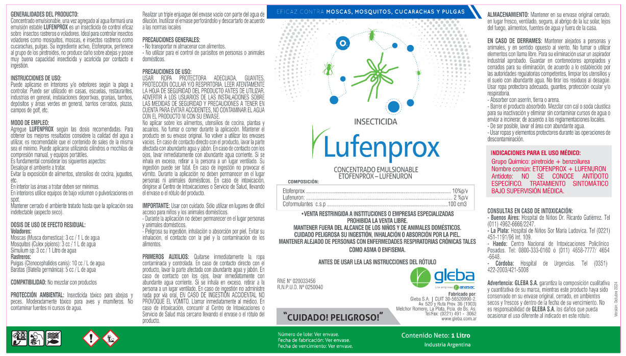 Concentrado emulsionable, una vez agregado al agua formará una emulsión estable. LUFENPROX® es un insecticida de control eficaz sobre insectos rastreros o voladores. Ideal para controlar insectos voladores como mosquitos, moscas, e insectos rastreros como cucarachas, pulgas. Su ingrediente activo, Etotenprox, pertenece al grupo de los piretroides y posee muy buena capacidad insecticida y acaricida por contacto e ingestión.